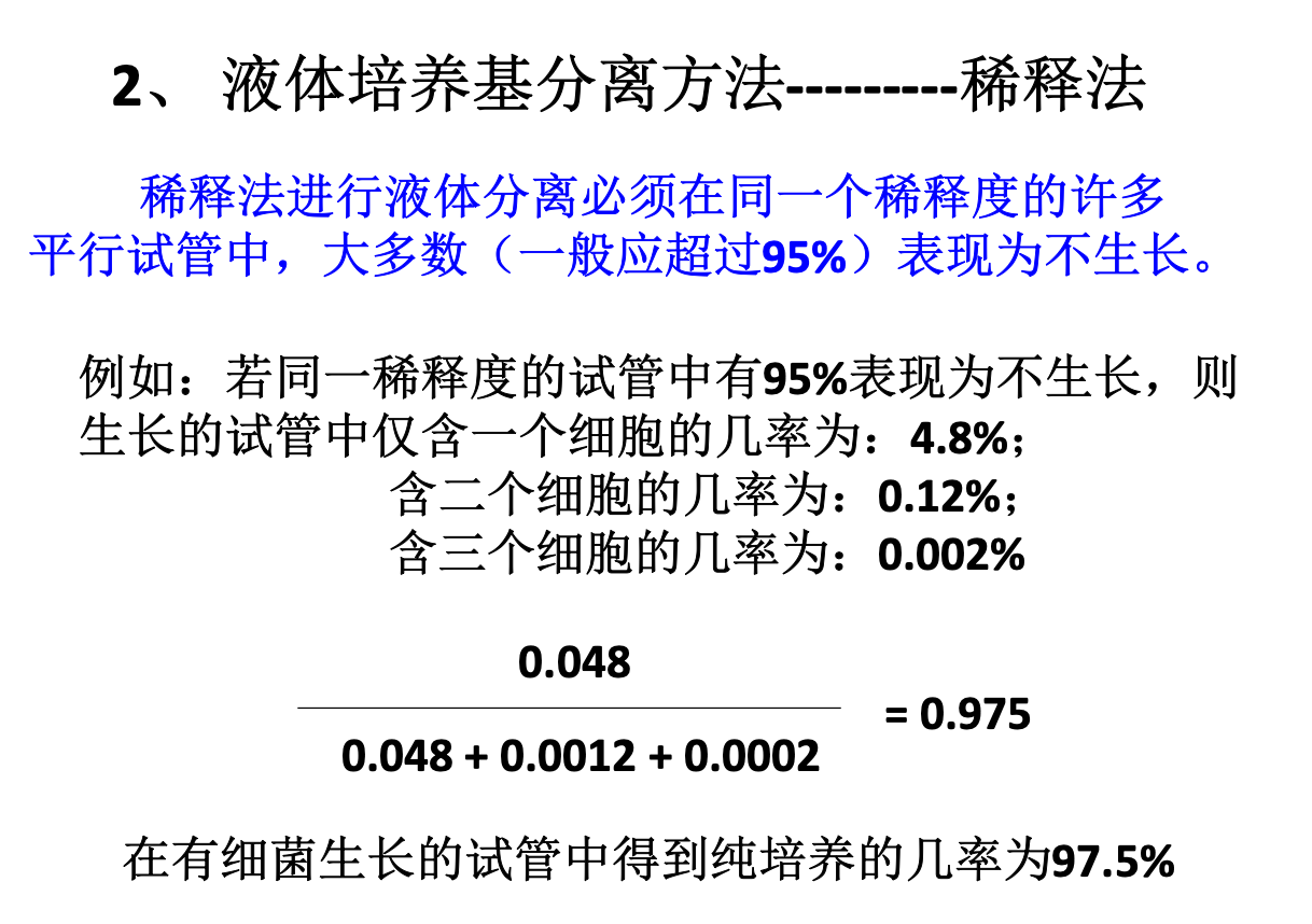 把含有细菌的液体稀释到非常低的浓度,然后分装到大量的试管中,以至于大多数试管(>95%)里连一个细菌都没有